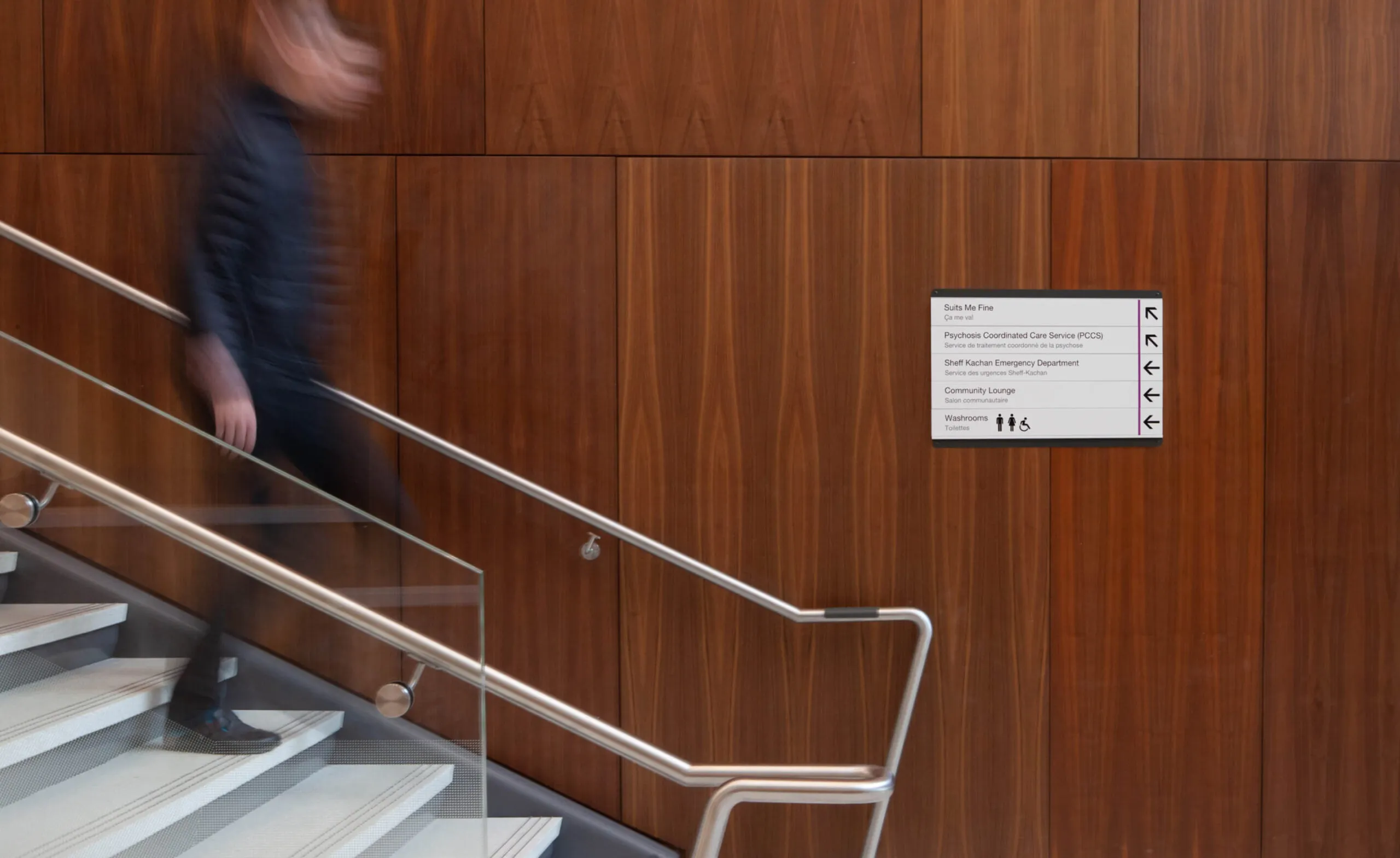The interior signage program for the new CAMH campus buildings improves the flow and movement of people throughout the space, as patients, visitors and staff have the tools they require to self-navigate the buildings. The signage welcomes the community and encourages people to utilize the building’s many resources.