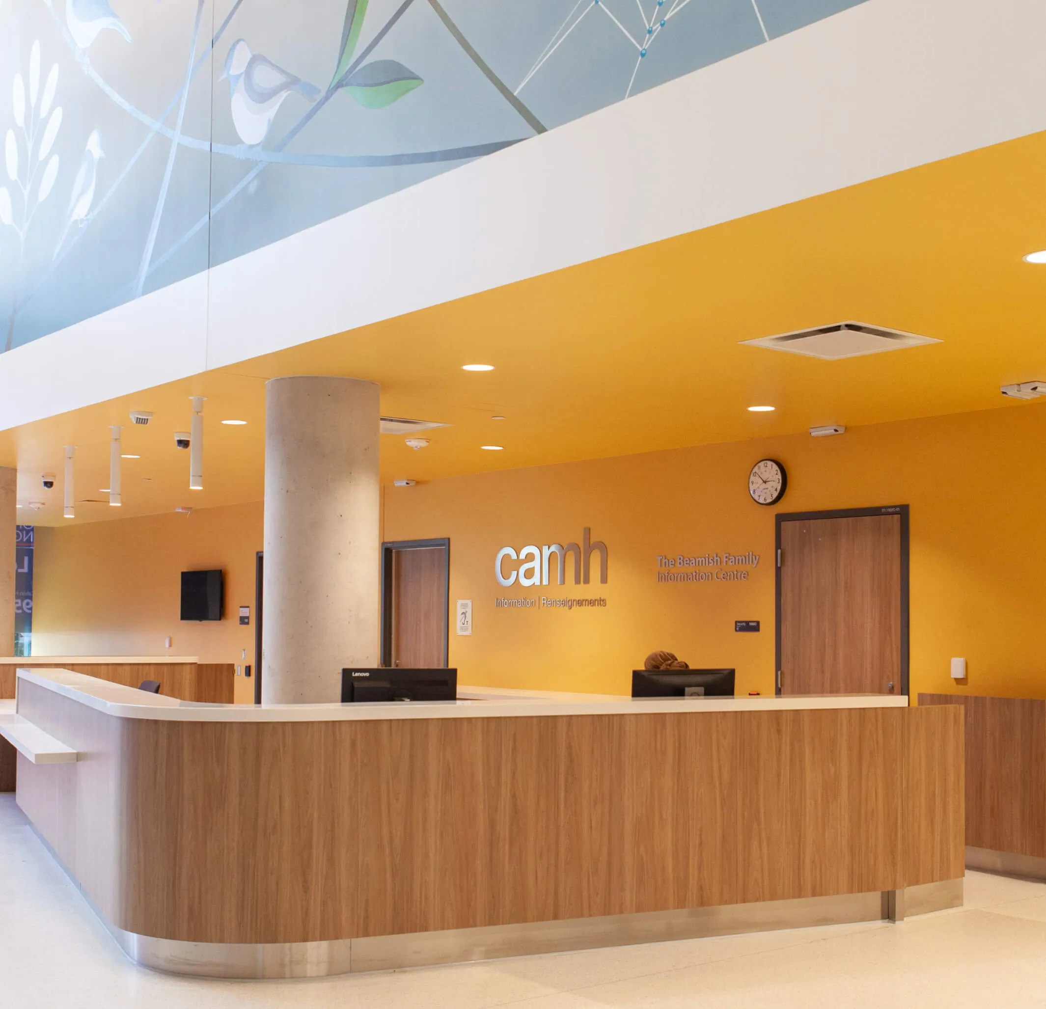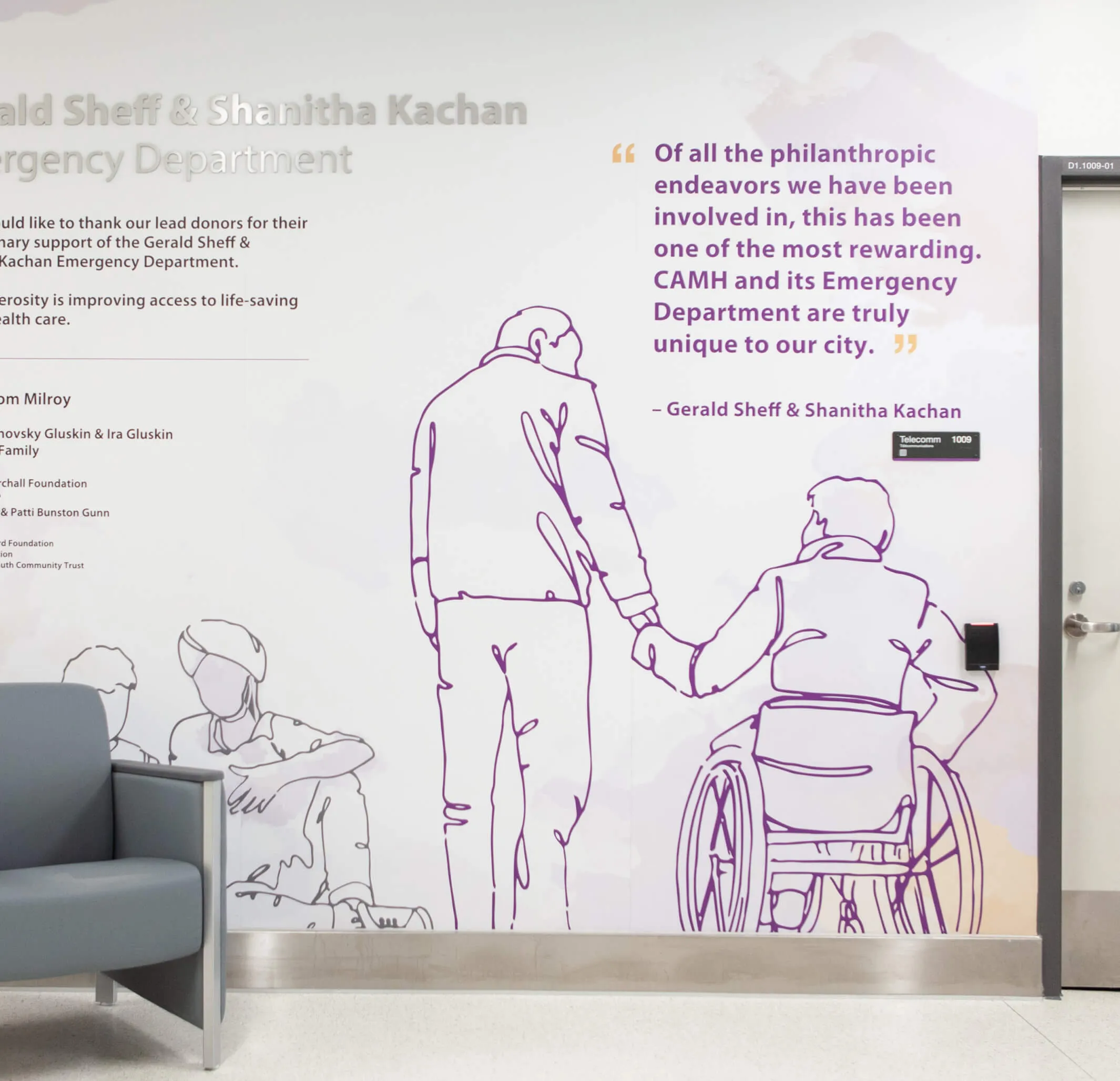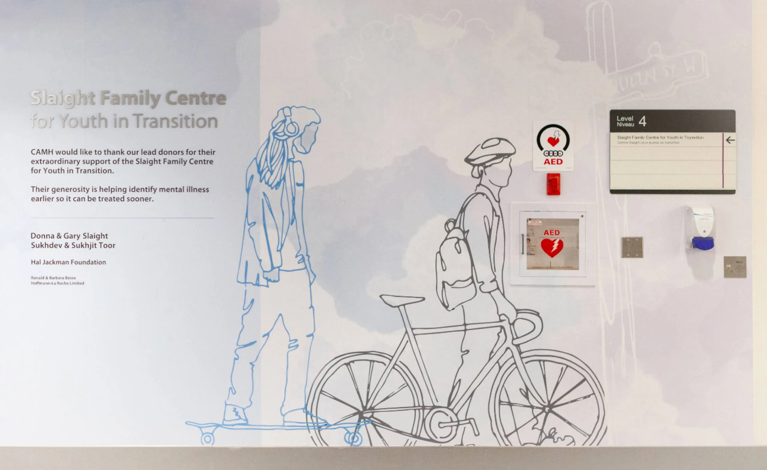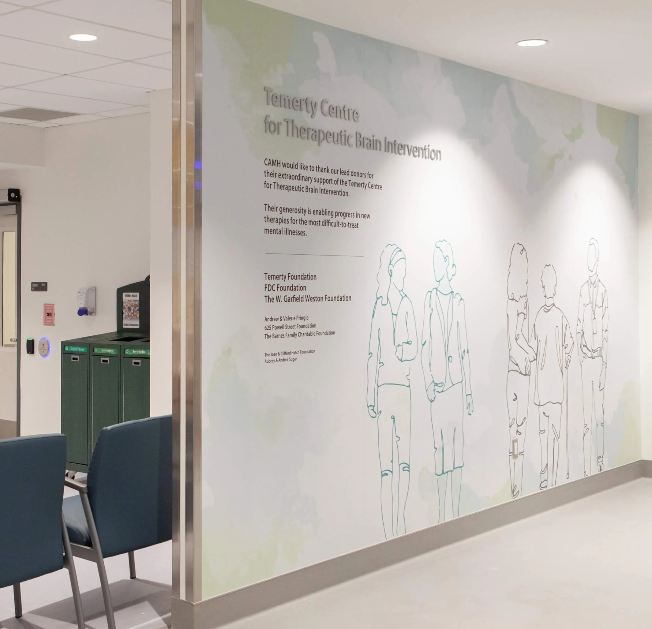 Vibrant murals featuring hand-drawn characters accompanied the written words of donors at the Ossington and Queen Street Campus. A wall for each department – representing the patients, the caregivers and the staff at CAMH – was thoughtfully designed and placed the patient’s unique journey at the forefront of one’s experience.