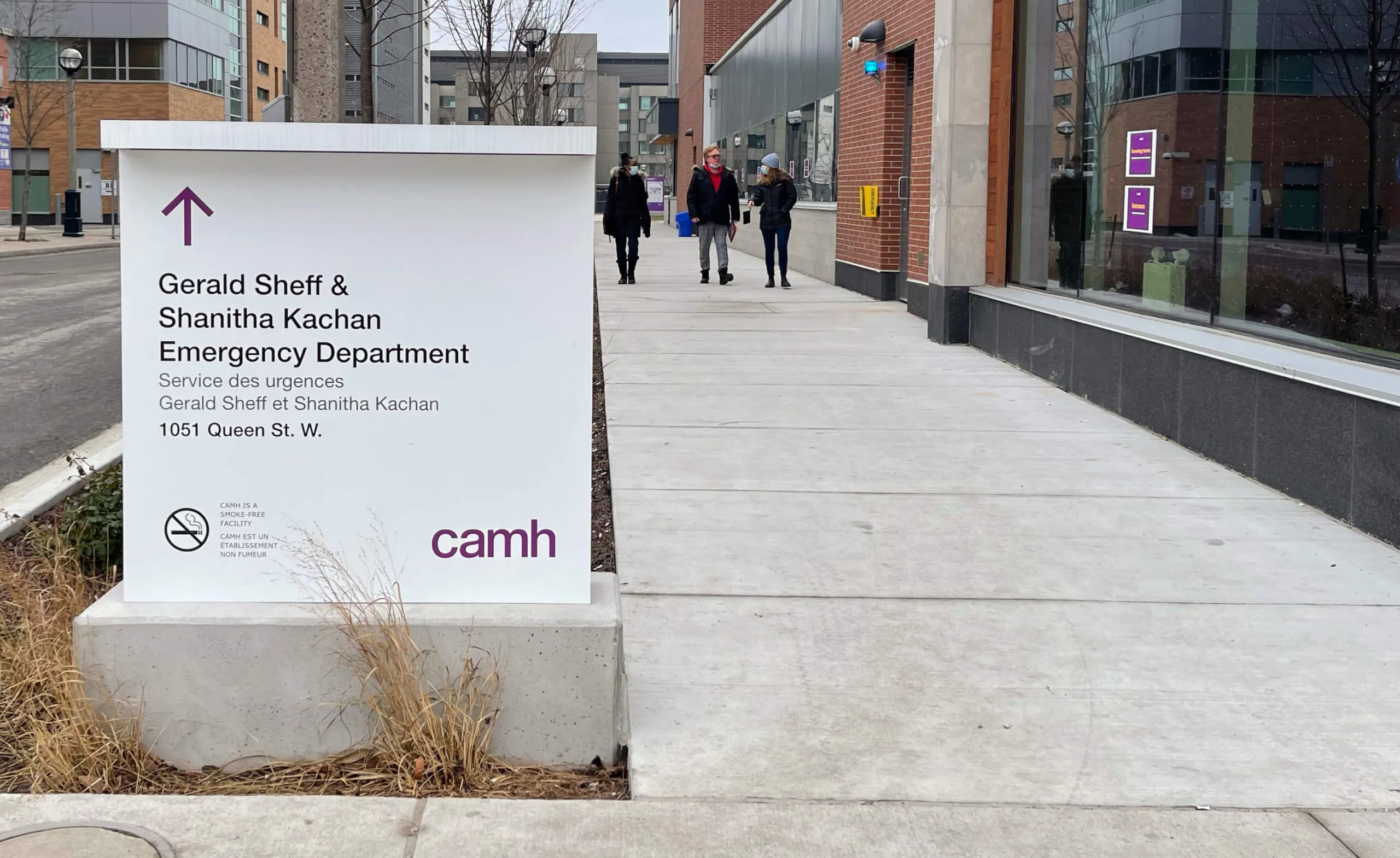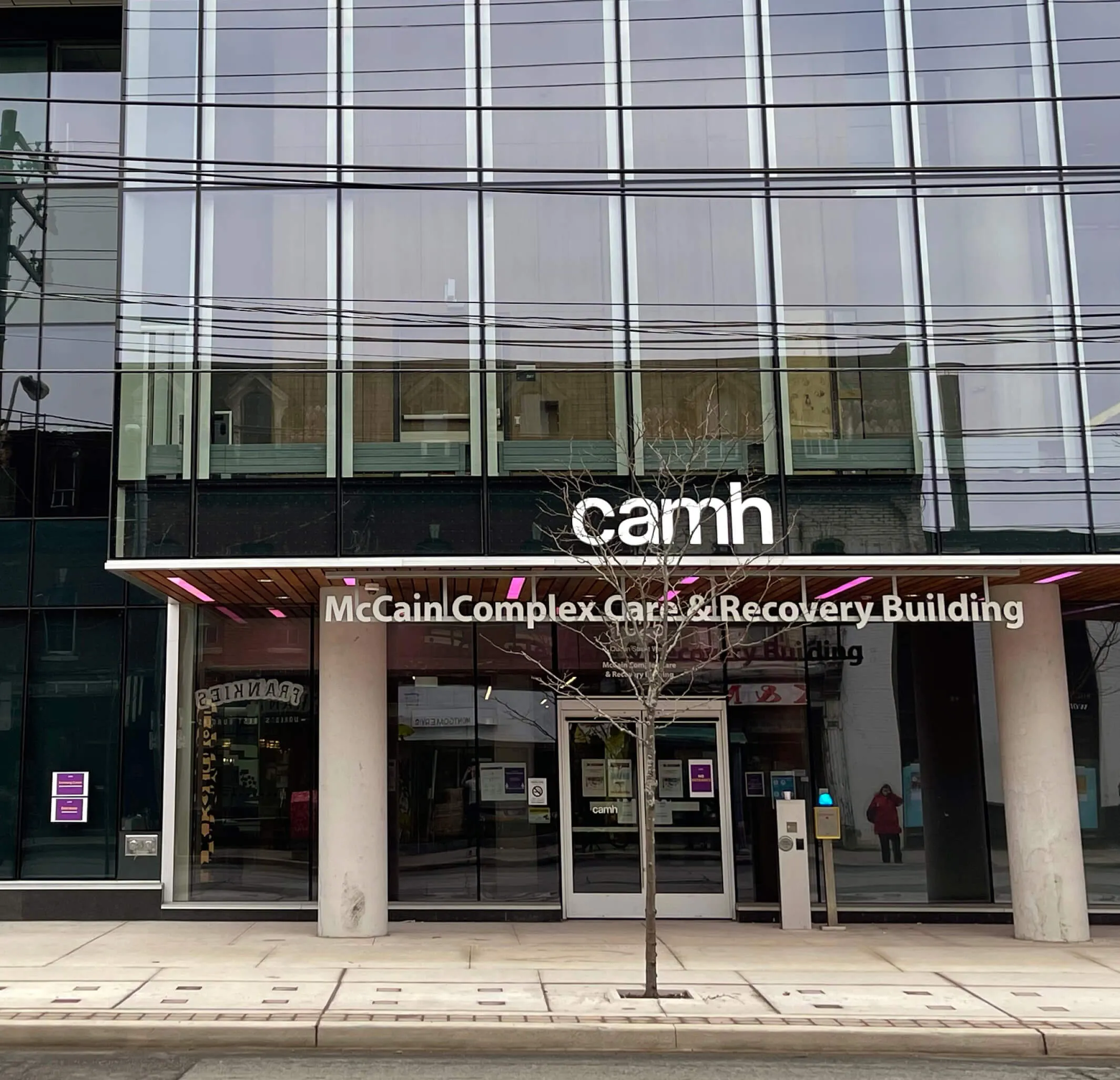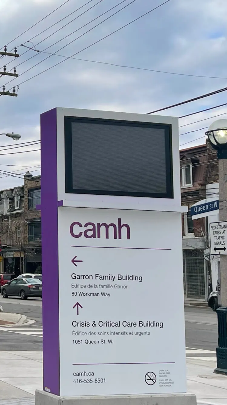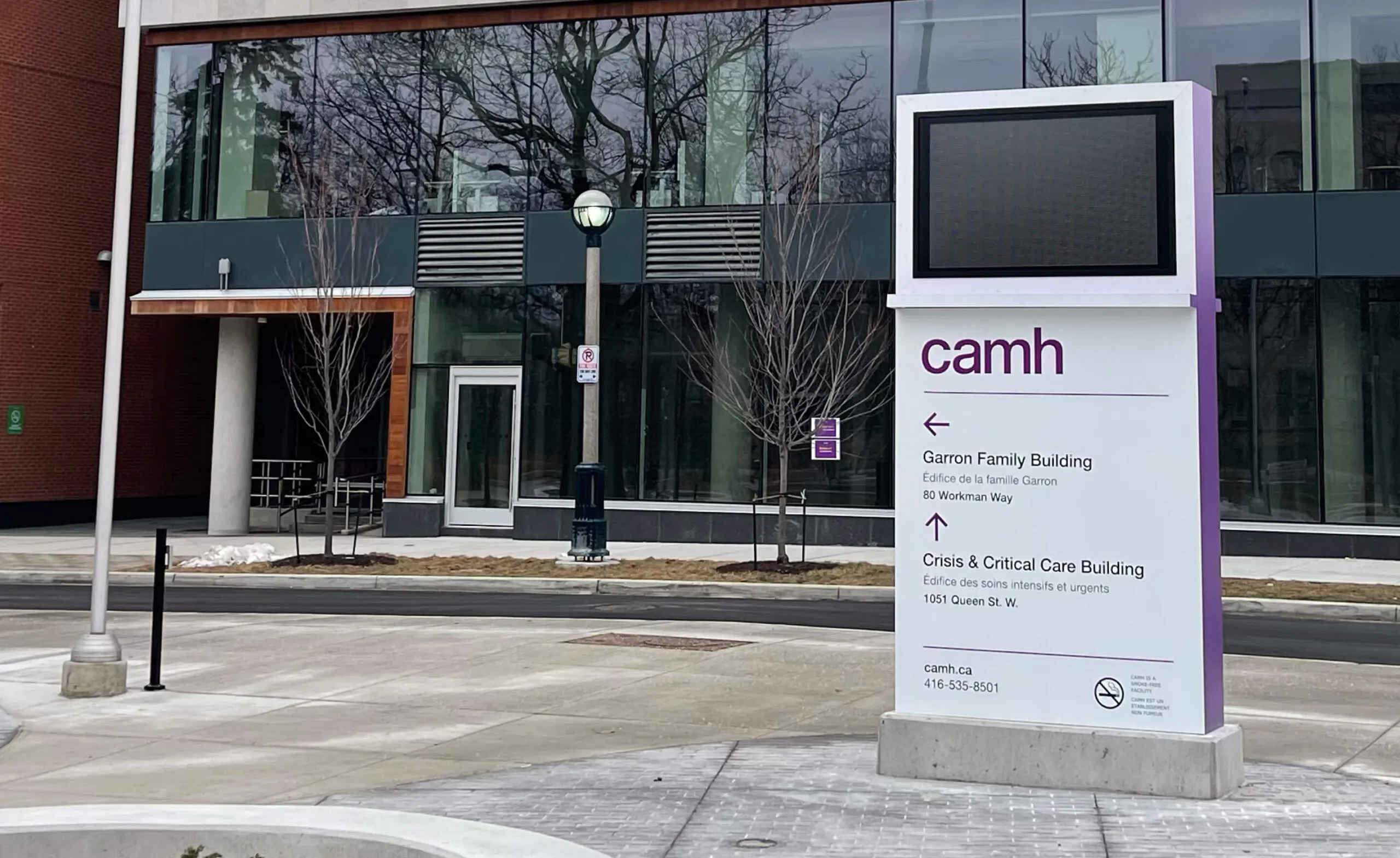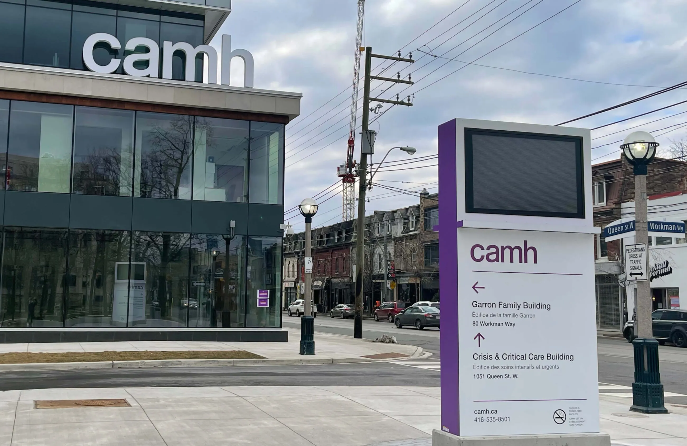 The Centre for Addiction and Mental Health (CAMH) is Canada’s largest mental health teaching hospital. CAMH drives innovative research, provides expert training to healthcare professionals, and advocates for social change. Working alongside Stantec and Acumen Visual Group, we developed a holistic wayfinding approach at CAMH’s Queen Street site to fully integrate two new CAMH campus buildings – Building B1 (McCain Complex Care & Recovery Building) and Building D1 (Crisis & Critical Care Building).