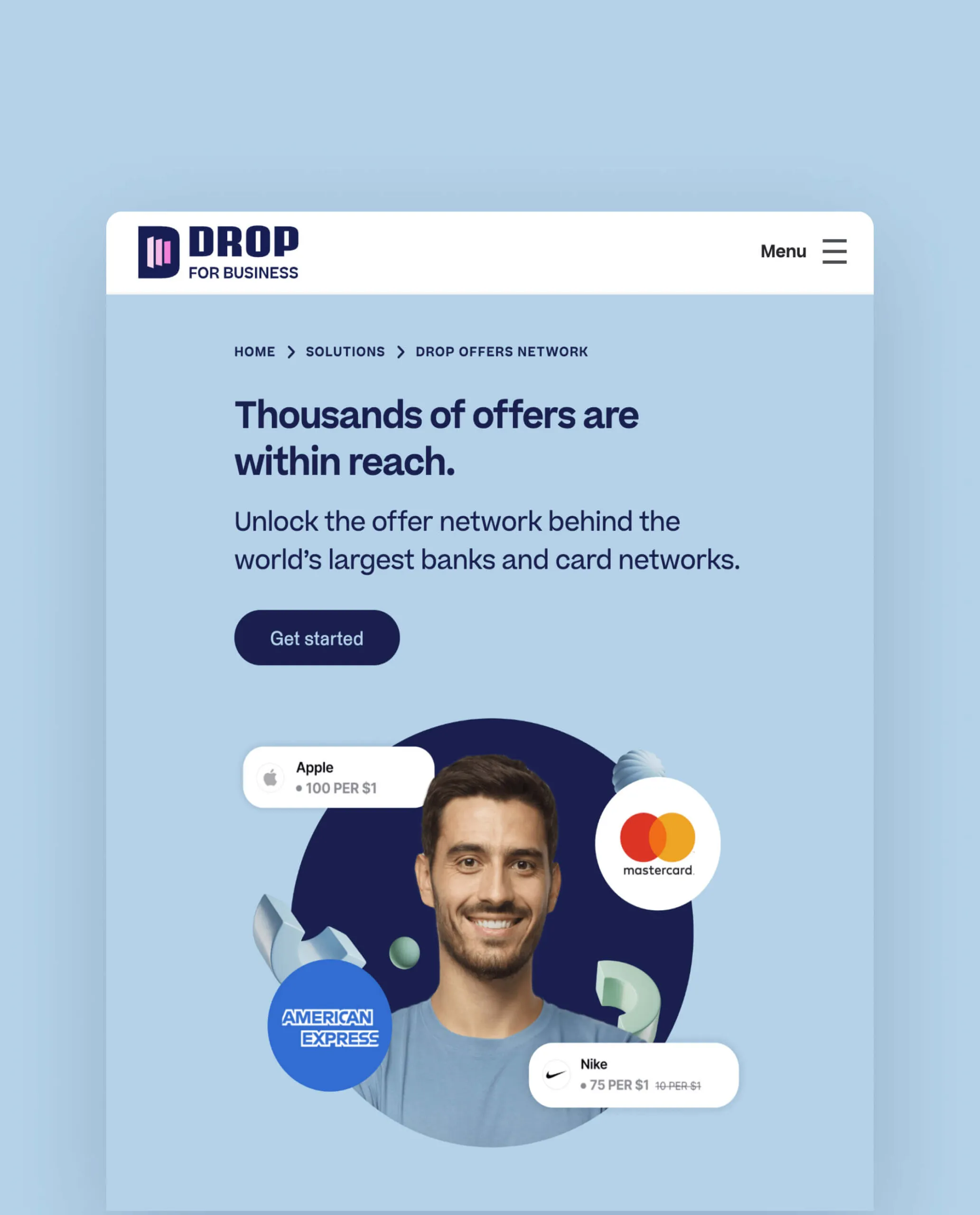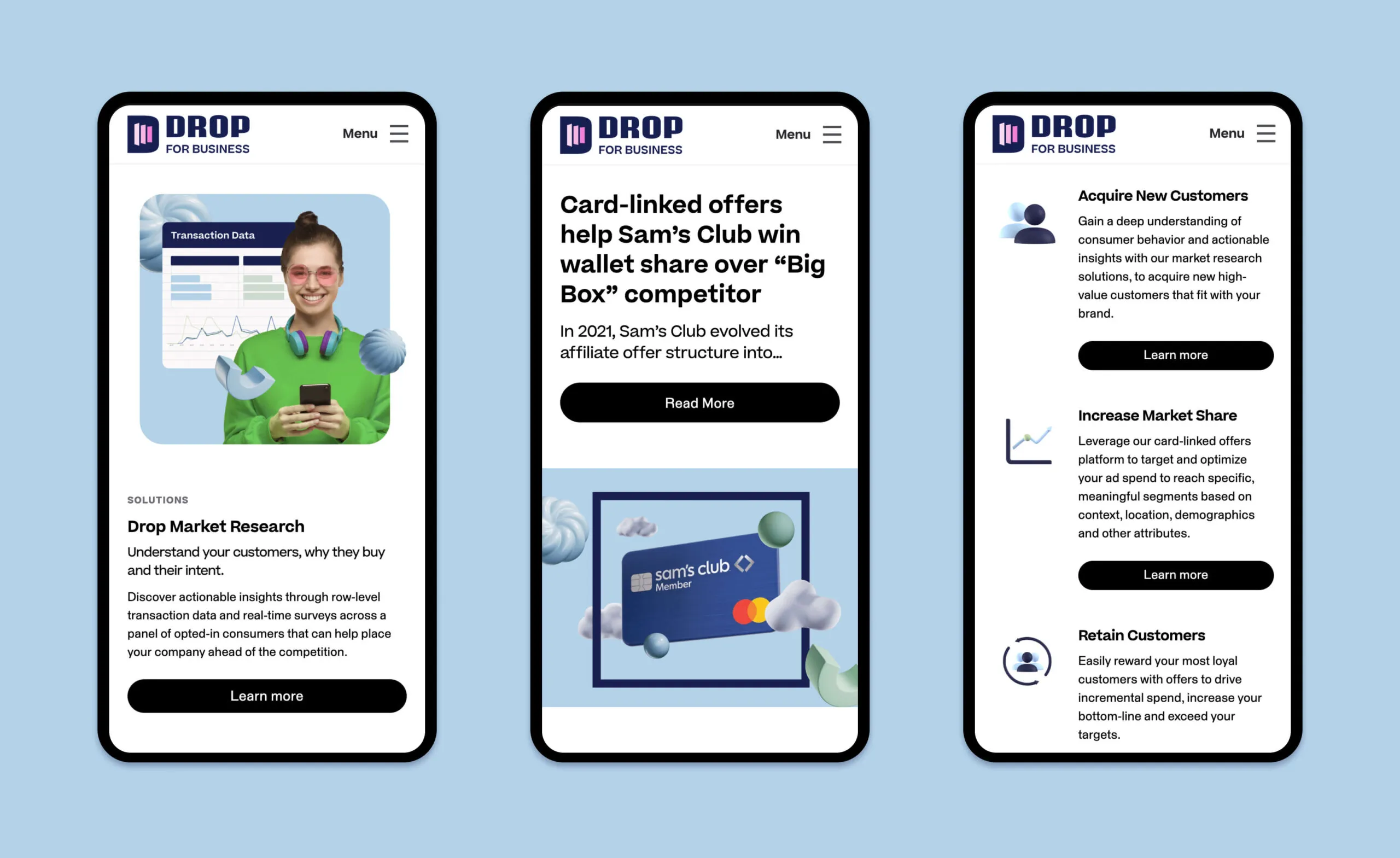 Aligning with the established branding, the team at Forge created a flexible design system that applied to both the consumer-facing and business-facing Drop websites, ensuring a consistent look and feel while targeting different audiences. The fully-responsive experience considered all screen sizes and included high accessibility standards in visual design and code.