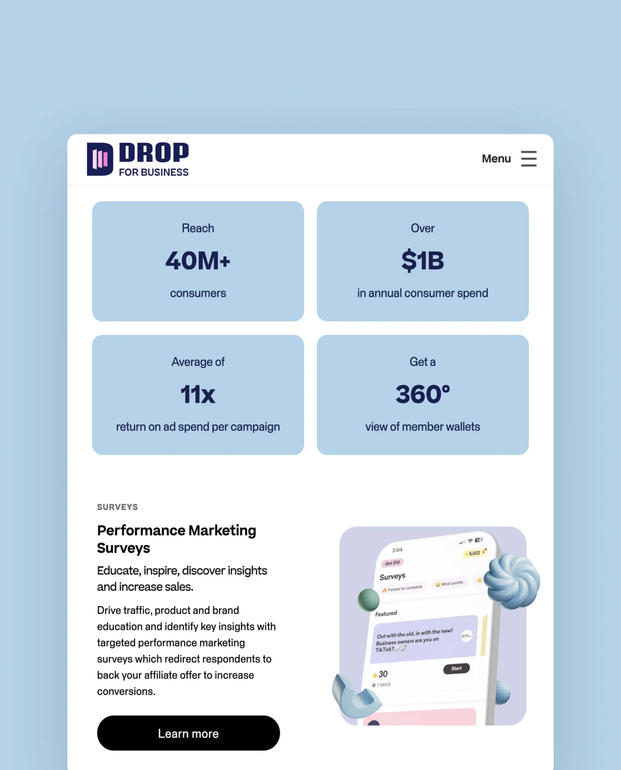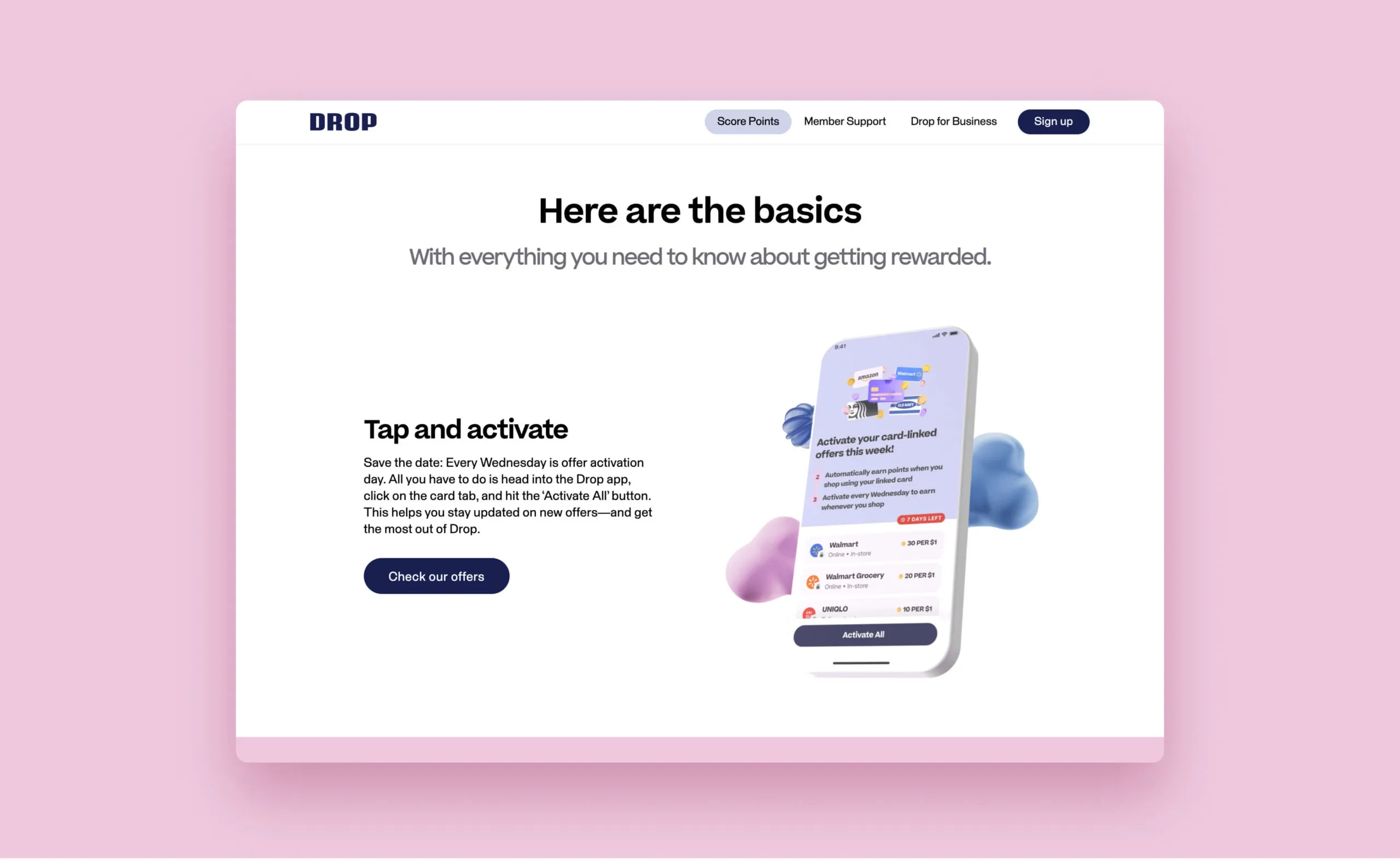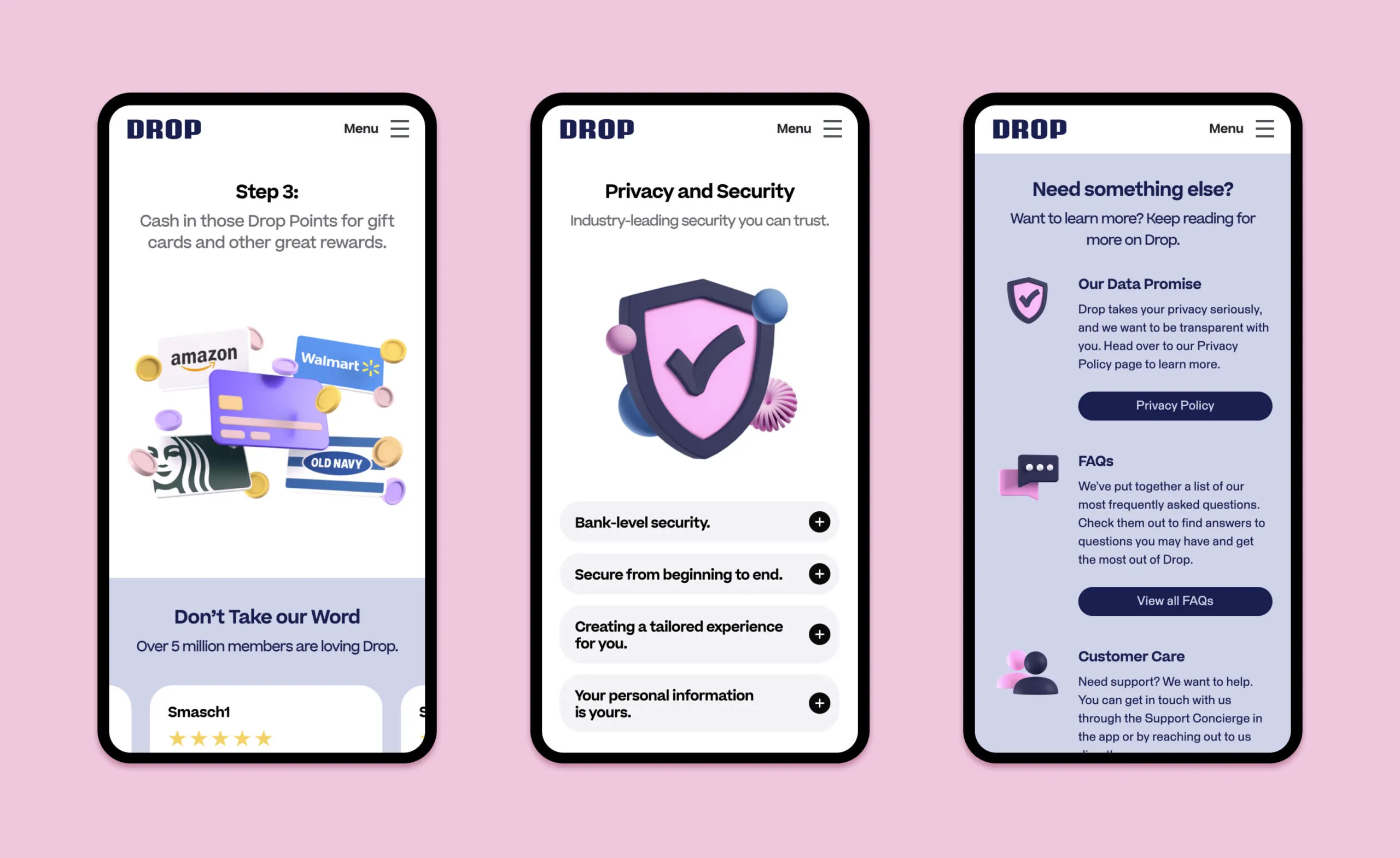 Drop, a free mobile rewards program, focuses on providing customers with a personalized and easy-to-use member experience. Drop members can earn and redeem points by shopping via the app, completing surveys and playing games. Looking to refresh their single-page web presence to better position the program, the Drop team worked closely with Forge to bring the website to life across multiple dynamic pages.