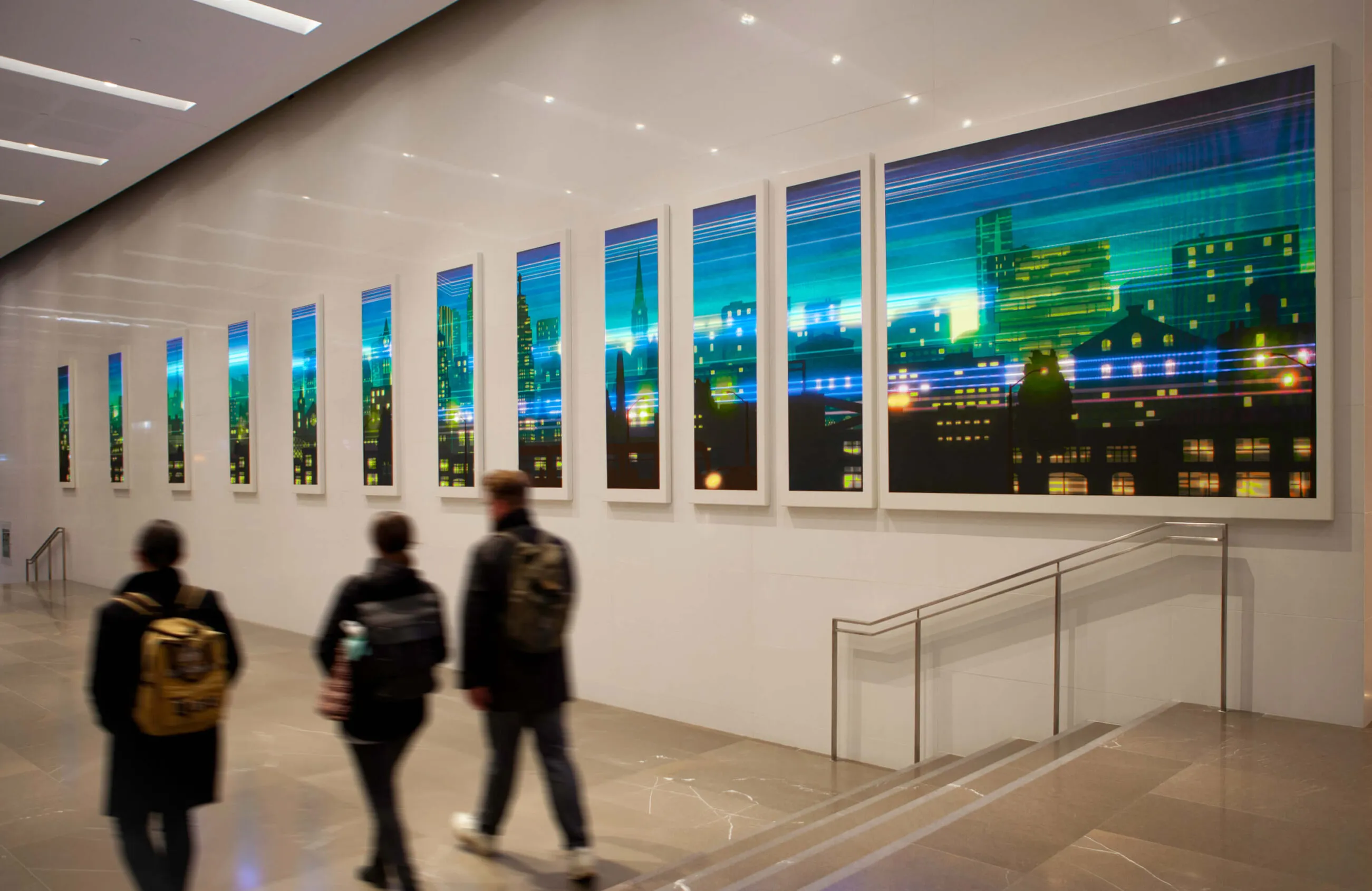 ‘Interstitial Space’ explores the symbiotic relationship between the city and its citizens. The piece actively translates the momentum of the lobby’s pedestrians, adding colourful lines that weave throughout the illustrated cityscape, revealing depth and imbuing energy into the art. Over the day, eight distinct eras celebrate the history of Toronto, from its humble beginnings in 1793 to its current vibrant state.