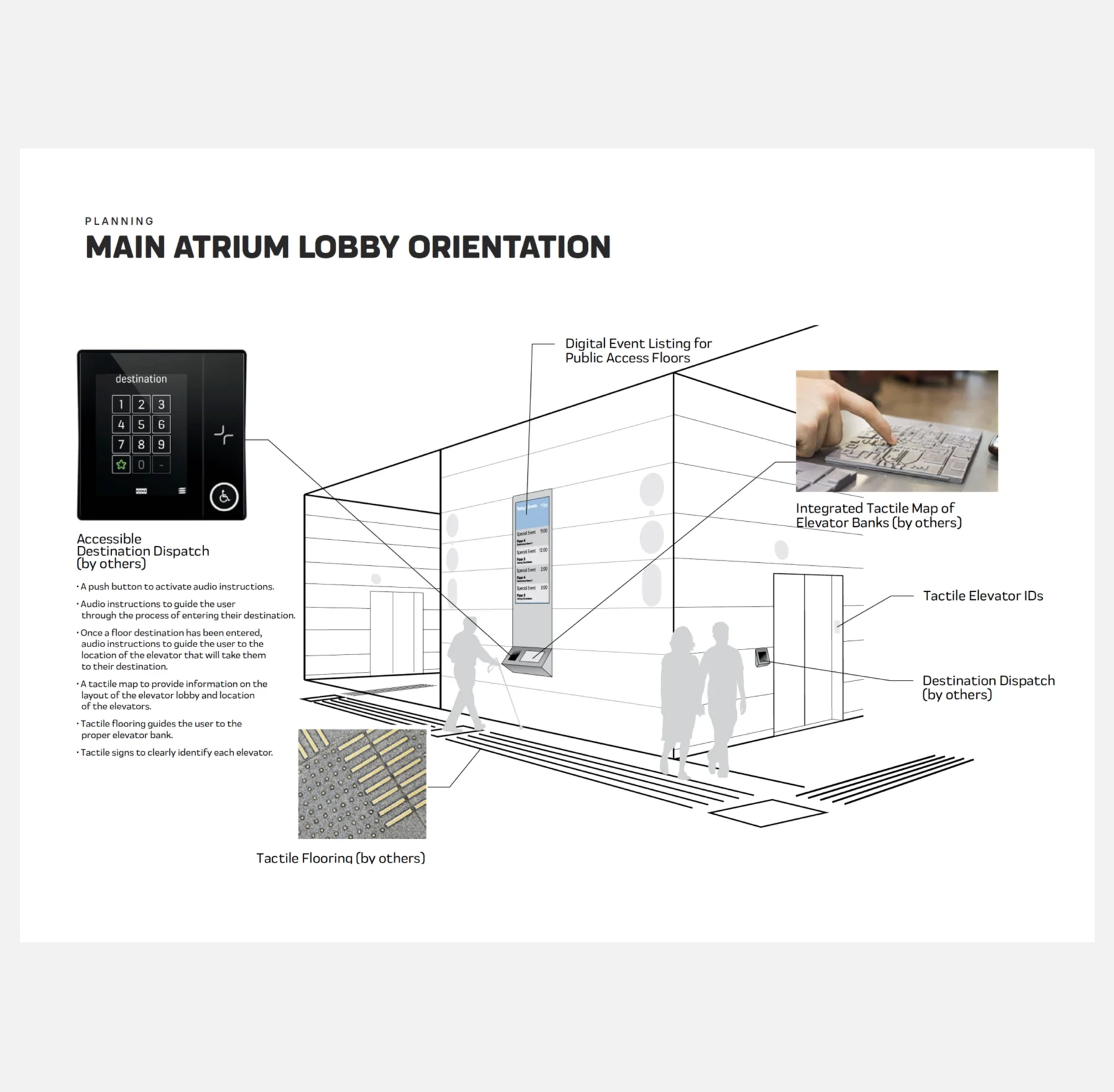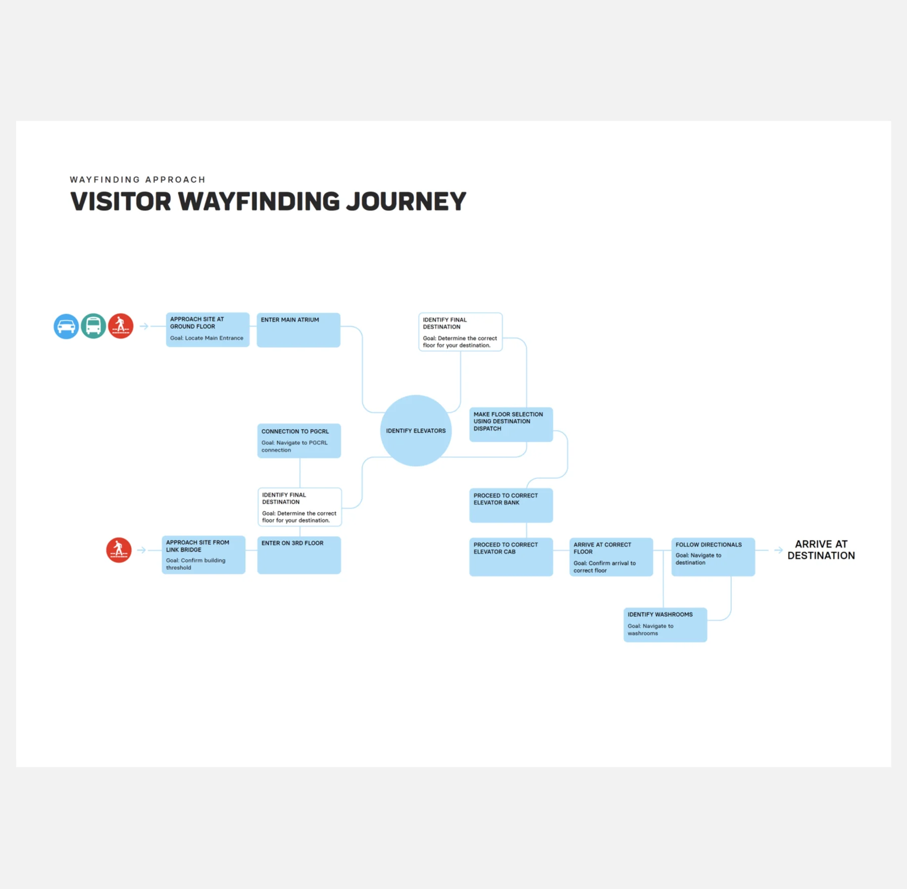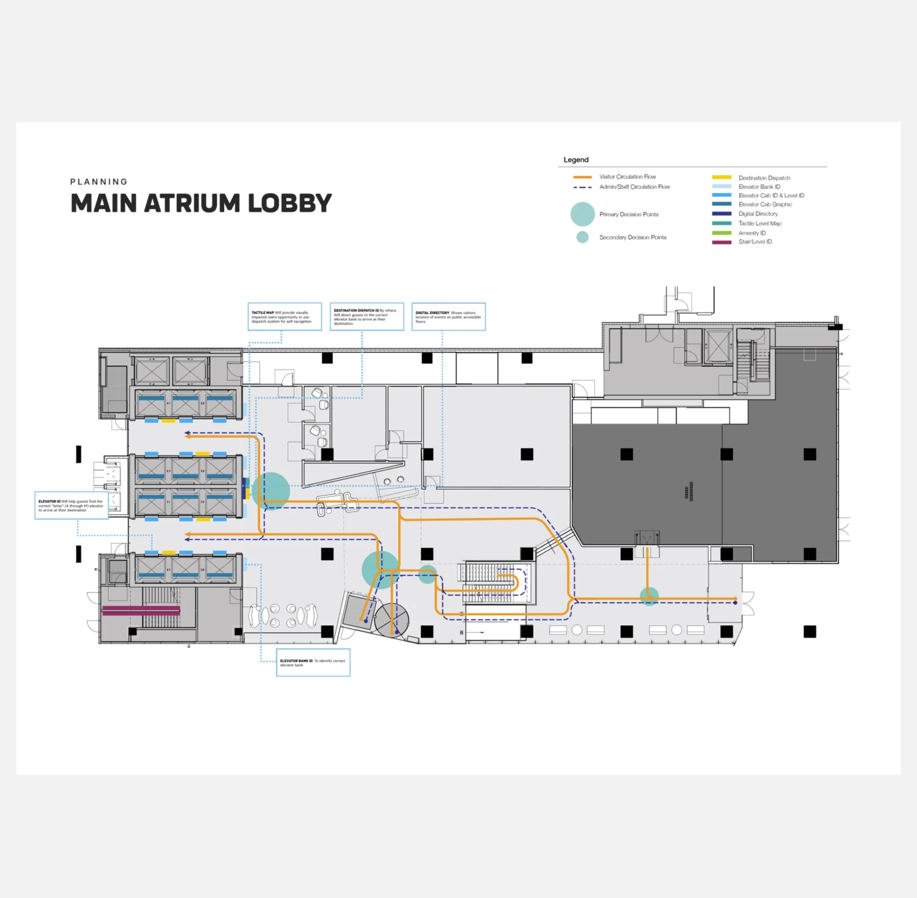 Promoting safe and independent movement for people of all abilities was also an important priority for SickKids. Wayfinding included development of tactile maps and cues at key locations for people with sight disabilities. Forge advised on proper semiotic use of pictographic language to be inclusive to a wide audience, ensuring that design of these elements felt aligned with the overall visual narrative.