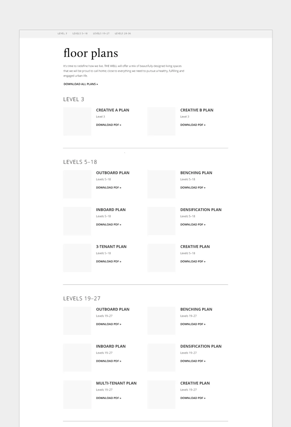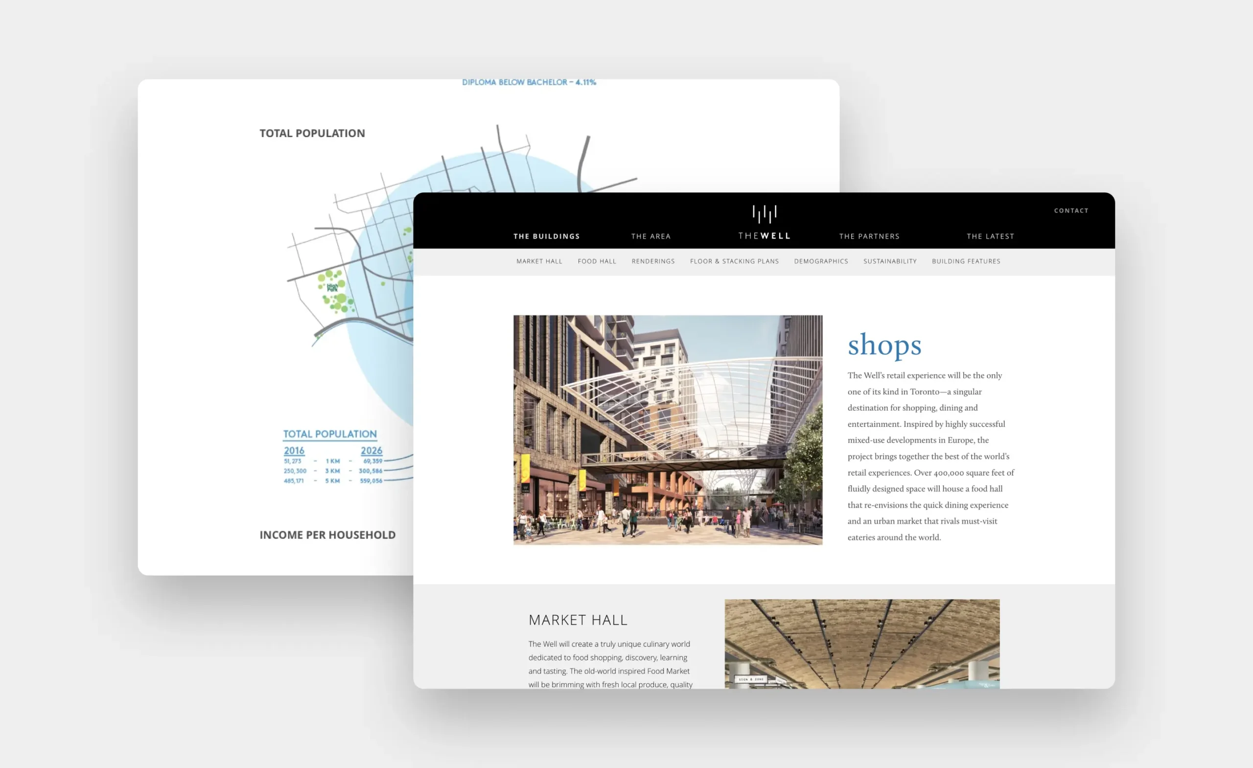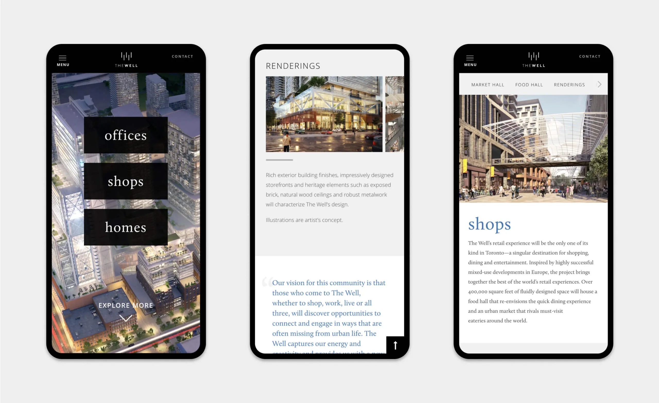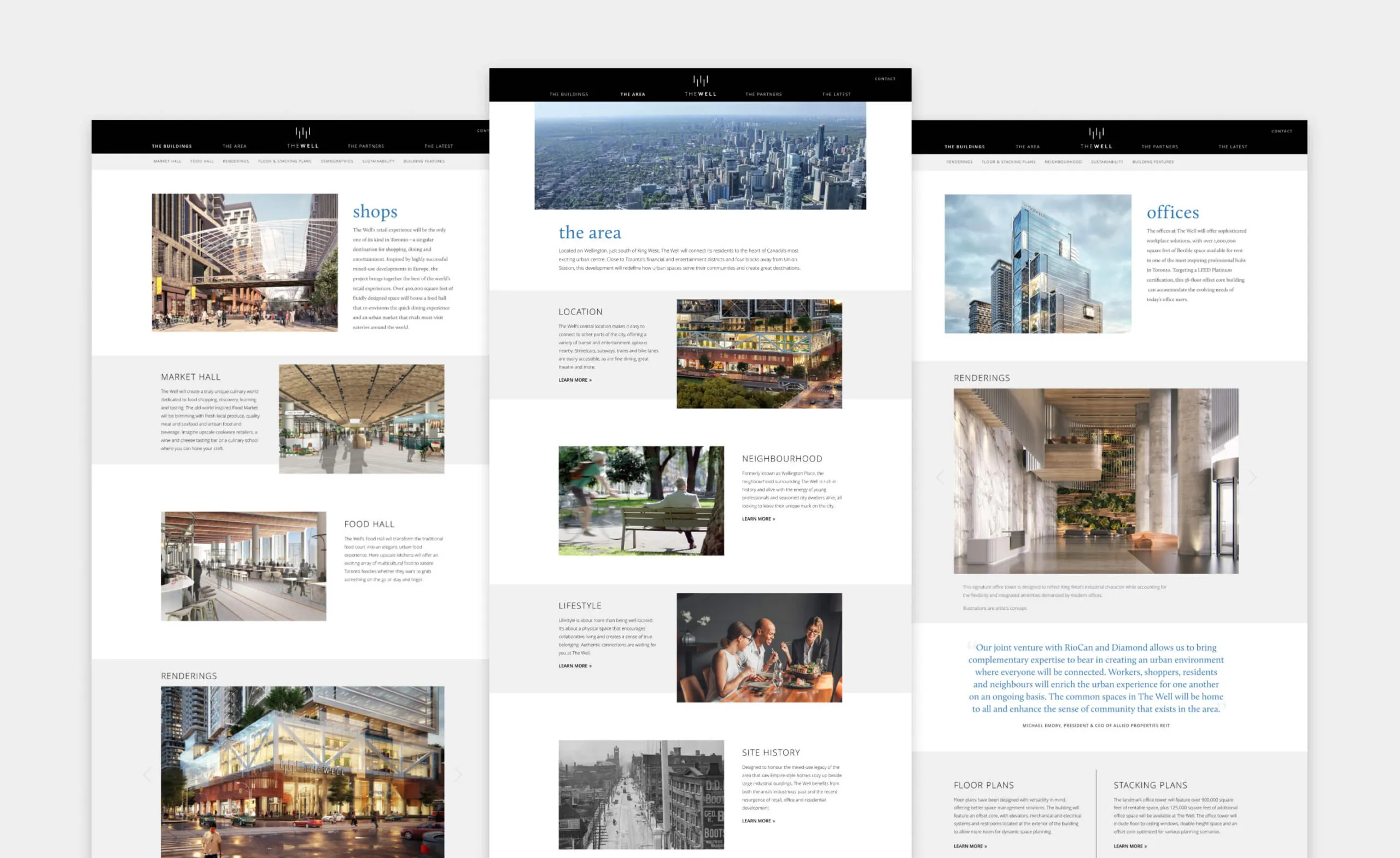 A website was created to showcase The Well’s various offerings, and provide an in-depth look at their residences, lifestyle amenities, flexible office spaces, retail locations, and the surrounding neighbourhood. Following an initial discovery phase, wireframes were created to determine an optimal strategy in presenting content and to create a dynamic and user-friendly experience.