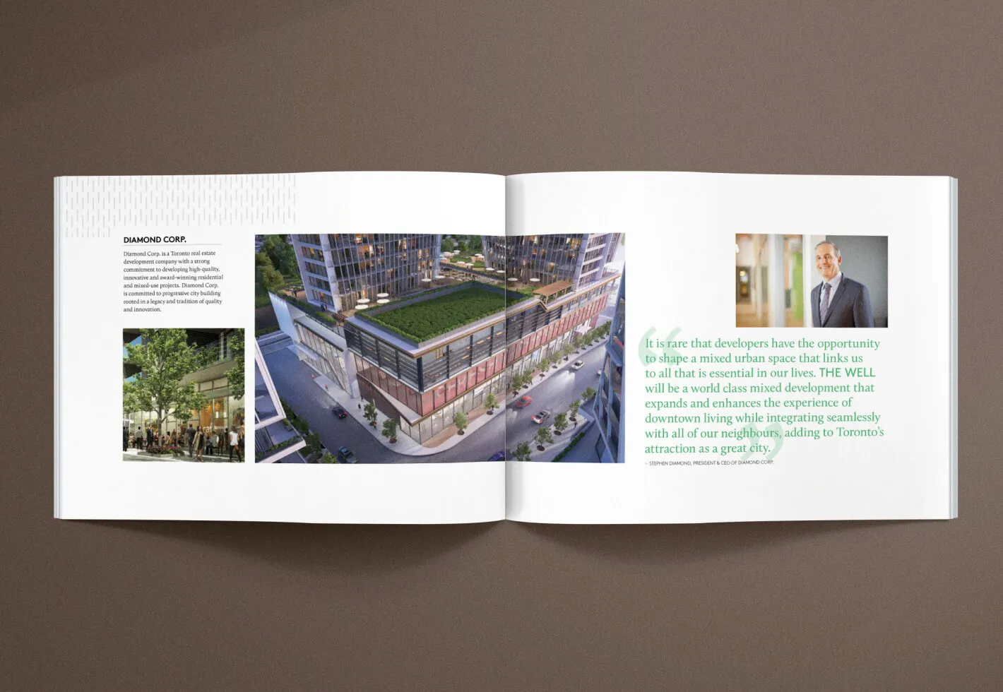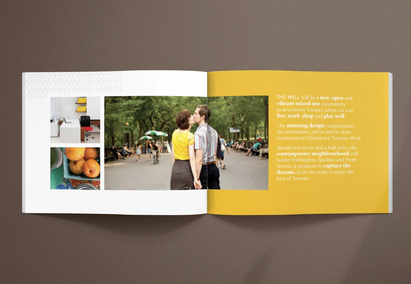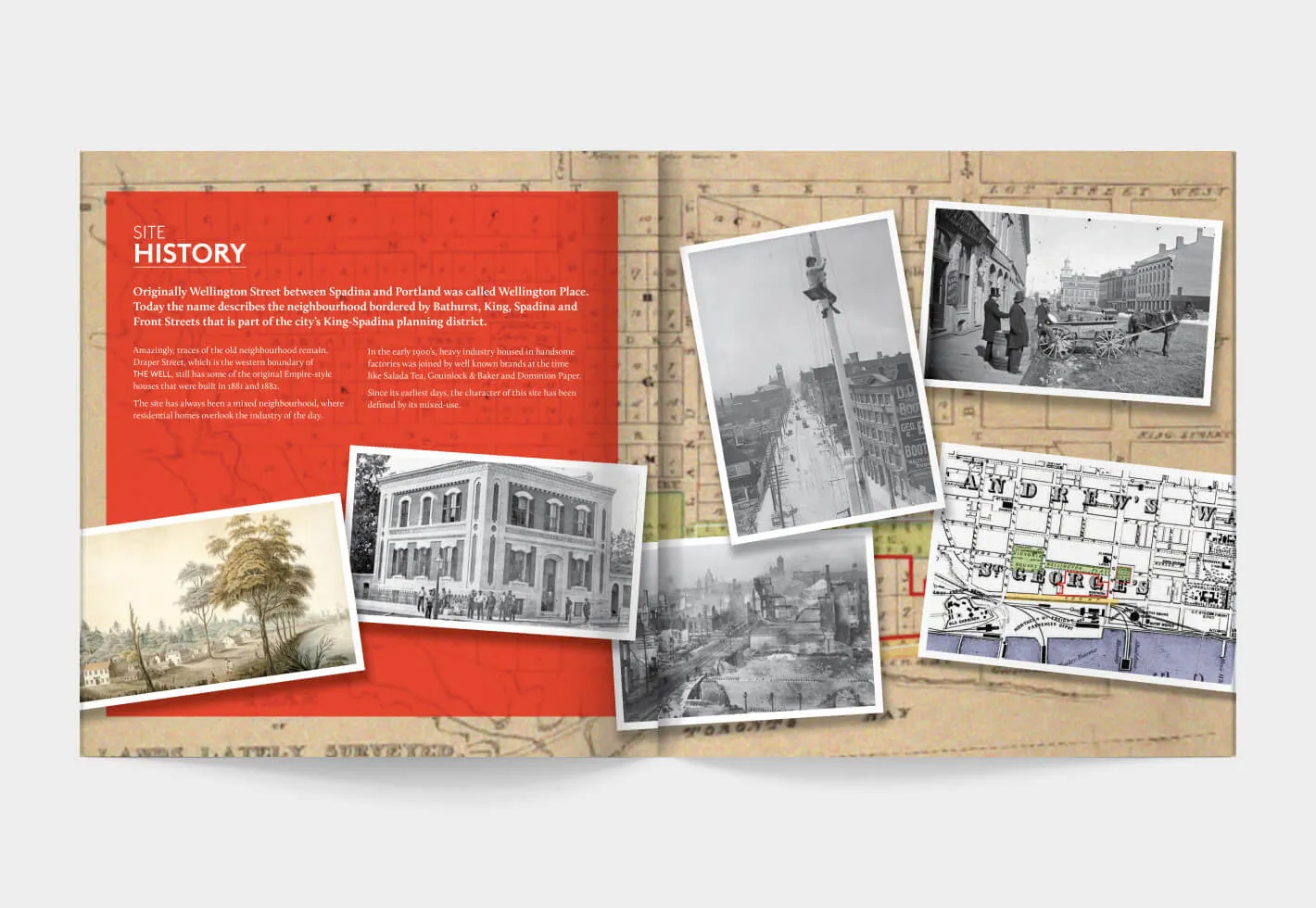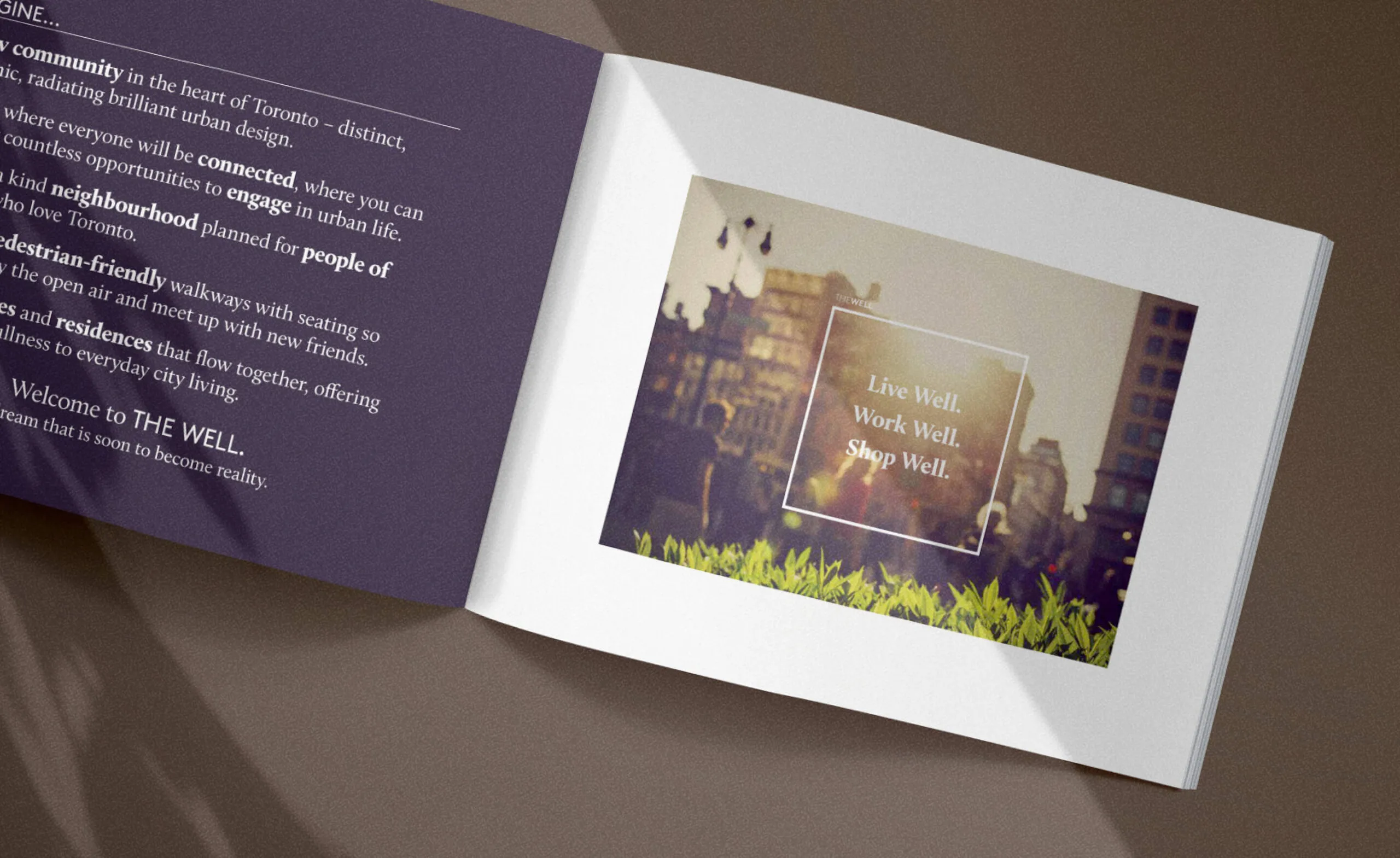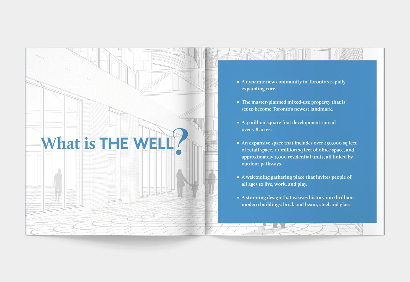 The Well is an innovative mixed-use property development in Toronto’s vibrant King West area where visitors and residents can eat, shop, work, live, and play. To introduce this multimillion-dollar endeavour to the public and generate buzz during a major media push, Forge created various marketing materials and brand assets including brochures with custom photography and vibrant layouts showcasing the properties features and the site’s exciting history.
